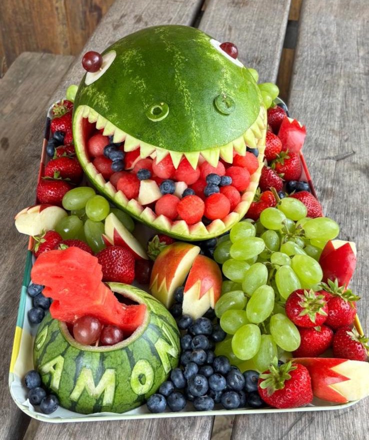 Ob Wassermelonen-Dinos, Frösche, Haie, Hasen,… meiner Kreativität sind keine Grenzen gesetzt. Auch mit Ananas, Orangen und anderen Früchten zaubere ich Tiere, Formen und Überraschungen, die jedes Buffet zum Erlebnis machen. Wie wäre es z.B. mit einem Ananasvogel oder einem Orangenbärchen?